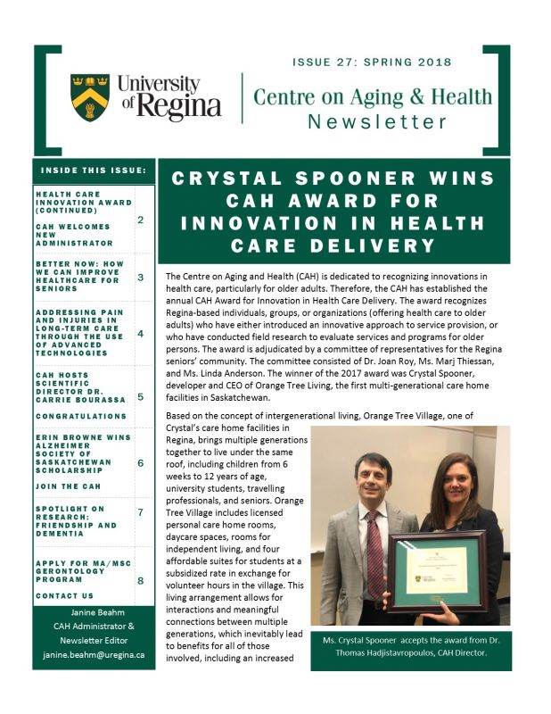 This issue contains stories about the latest winner of our CAH Award for Innovation in Health Care Delivery, our recent Distinguished Lecture and Brain Awareness Week Event, a visit by a CIHR Scientific Director (Dr. Carrie Bourassa), a spotlight on a CAH affiliate researcher’s work, an article on the Alzheimer Society of Saskatchewan Scholarship, and much more.