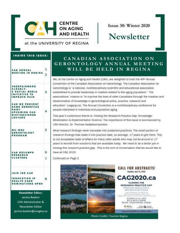 This issue contains stories about: the upcoming Canadian Association on Gerontology annual meeting held in Regina, the upcoming CAH distinguished lecture, updates to our research clusters, the #SeePainMoreClearly campaign, and more.