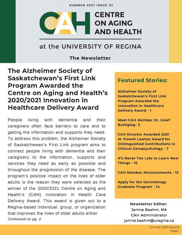This issue contains stories about: The Alzheimer Society of Saskatchewan’s First Link Program being awarded the CAH 2020/2021 Innovation in Healthcare Delivery Award, CAH member Dr. Josef Buttigieg, the CAH director being awarded the 2021 M. Powell Lawton Award for Distinguished Contributions in Clinical Geropsychology, the Lifelong Learning Centre moving to remote delivery, and more.