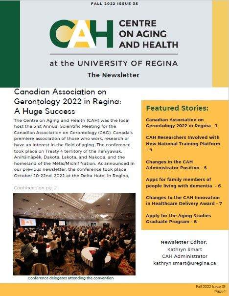 This issue contains stories about: The 51st Annual Scientific Meeting for the Canadian Association of Gerontology (CAG) hosted in Regina October 20-22, 2022, CAH researchers involved with new EPIC-AT national training platform for accelerating digital health solutions for older adults, the CAH administrator position, Louise Castillo’s research on apps for family members caring for people living with dementia, and changes to the CAH Innovation in Healthcare Delivery Award.