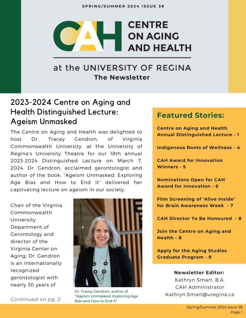 This issue contains stories about: Dr. Tracey Gendron’s 2023-24 CAH Distinguished Lecture, CAH Member Dr. Angela McGinnis’s research on Indigenous horticulture funded by a Saskatchewan Health Research Foundation (SHRF) 2023-2024 Truth and Action Mobilize grant, the latest winners of the CAH Award for Innovation in Health and Wellness, our 2024 Brain Awareness Week Film Screening, and the CAH Director’s upcoming induction into the Saskatchewan Order of Merit.